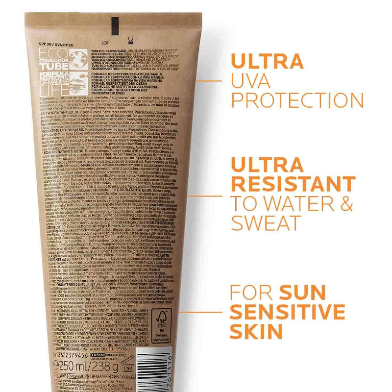 La Roche Posay Anthelios Leche Hidratante Fps 30 250 ml. Leche solar hidratante eco sostenible con factor de protección 30. Su fórmula está elaborada para la protección de las pieles sensibles y reactivas. Ofrece una muy alta protección UVA y se combina con tecnología Netlock combina una protección solar ultra alta y ultra resistente, en una fórmula más repetuosa con la vida marina.
