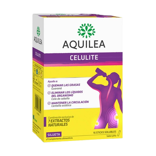 Aquilea Celulina es un complemento alimenticio en ampollas bebibles. Su fórmula a base de algas (laminaria digitata, palmaria palmata), semillas de uva y té verde, contribuye a la eliminación de las grasas, ayudar a la circulación y reducir el volumen corporal, consiguiendo una mejora visible en el aspecto de la piel.
