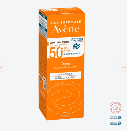 Avene Solar Crema spf50+ Piel Sensible Seca 50 ml. Es una crema solar de muy alta protección y de espectro muy amplio. Es perfecto para el cuidado de las pieles senisibles y secas.