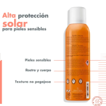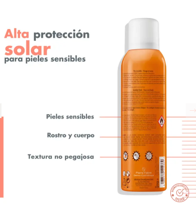 Avene Bruma Satinada SPF30 150 ml. Indicado para cara, cuerpo y cabello. Apto para piel sensible al sol y pieles propensas a quemaduras. No vaporizar sobre los ojos. No pegajoso. Acabado invisible. Formula biodegradable. Resistente al agua.