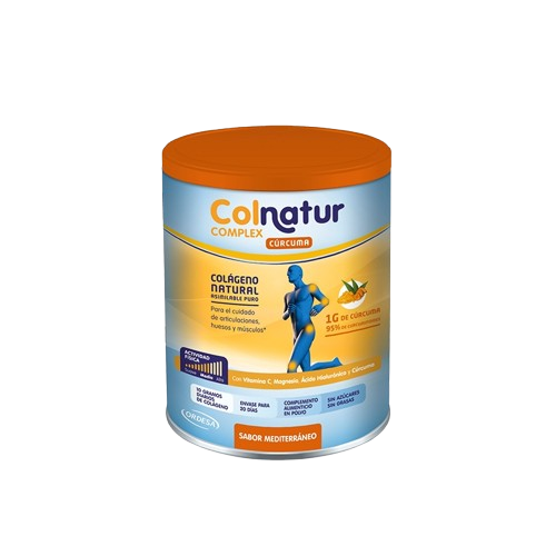 Colnatur Complex Curcuma Sabor Mediterraneo 250 g. Es un complemento alimenticio a base de proteínas de colágeno hidrolizada (natural, muy asimilable y pura) enriquecida con magnesio, vitamina C, ácido hialurónico y cúrcuma.