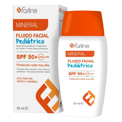 Farline Fluido Facial Pediátrico SPF 50+ Fluido mineral pediátrico cuya composición es 100% con filtro mineral, lo cual hace que se apto para piel atópica, sensible y reactiva. Está enriquecido con aloe vera y aceite de jojoba, qe refuerzan la fórmula para aportar hidratación y confort a la piel. Apto para bebés a partir de 3 meses