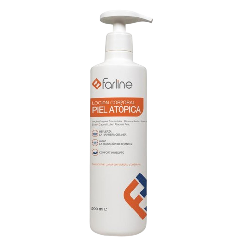 Farline Loción Corporal Piel Atópica Loción corporal de rápida absorción para el cuidado dermatológico de la piel seca con tendencia atópica. Los ácidos grasos esenciales omega 3 y 6 con alto poder nutritivo, refuerzan la barrera de la piel, aliviando los picores y la sensación de tirantez en la piel. Contiene glicerina y almidón de arro que mantienen la piel hidratada de forma duradera.