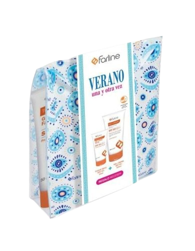 Neceser para cuidado solar completo. Contiene un protector solar corporal Farline Gel-crema SPF 50+ 200ml + un protector solar facial Toque seco Farline SPF 50+ 50 ml, de textura ultraligera, y acabado sedoso para la piel