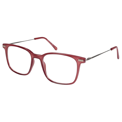 Gafa de presbicia con cristal cuadrado y montura de pasta roja. Patillas finas de alambre con terminación de pasta y detalle metálico en la unión de la patilla con la parte delantera de la gafa.