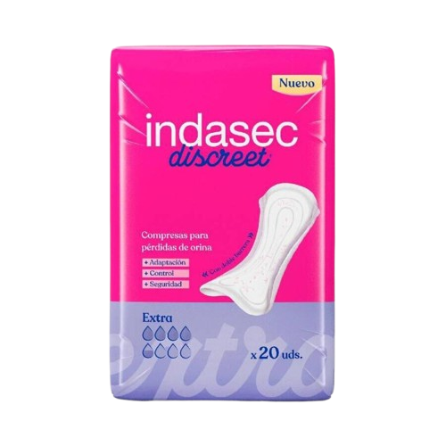 Indasbox Indasec Discreet® Extra para Pérdidas Leves. Es una compresa cómoda y discreta que se adapta muy bien a la anatomía femenina. Es capaz de contener pérdidas leves de orina, y tiene una alta capacidad de absorción y retención. La cobertura exterior está hecha en un material suave al tacto y transpirable, que mantendrá fresca la zona. Cuenta con dermobandas impregnadas con una solución que protege la piel. Está formulada con extracto de ambiaty que estimula la regeneración celular manteniendo la piel hidratada. También contiene grosella negra que aporta aceites grasos esenciales y aloe vera que ejerce una acción antiinflamatoria y calmante.
