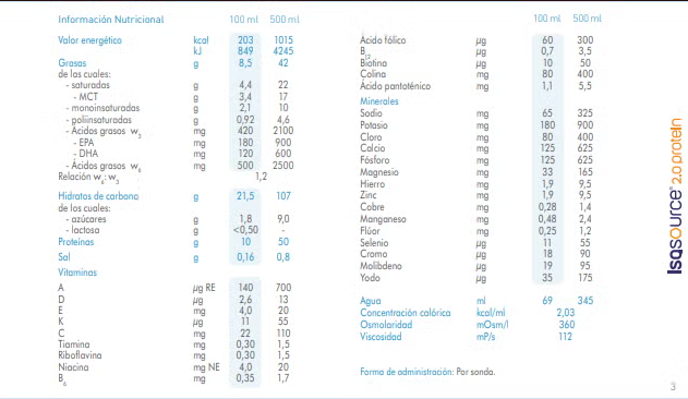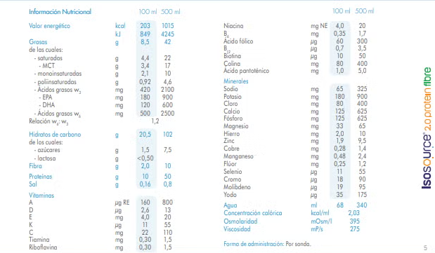 Isosource® 2.0 Protein e Isosource® 2.0 Protein Fibre son dietas destinadas al manejo dietético de pacientes con requerimientos proteicos y energéticos aumentados, restricción hídrica y problemas de ingestión, digestión, absorción, que cursan con desnutrición o riesgo de desnutrición y que requieren de nutrición enteral por sonda.