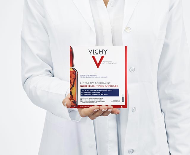 Una innovación antienvejecimiento que actúa sobre diferentes tipos de hiperpigmentación (manchas oscuras, manchas de la edad y marcas de acné) en una ampolla protectora de vidrio que aporta cada noche la dosis adecuada a tu piel. El poder del Agua Volcánica de Vichy enriquecida con un complejo de Ácido Glicólico al 10 %, un activo de referencia antimanchas recomendado por dermatólogos, y Vitamina CG. Eficacia clínicamente probada. Sin fragancia