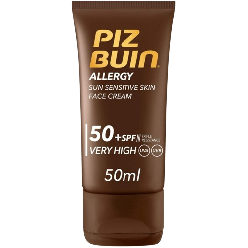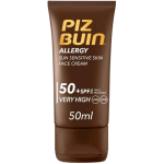 Piz Buin Allergy FPS 50+ Crema Facial 50 ml alta protección para la cara que es la parte del cuerpo que mas tiempo está expuesta al sol. Esta crema está especialmente formulada para las pieles sensibles y que necesitan una protección especial. Se absorbe rapidamente y mantiene la cara hidratada durante horas.