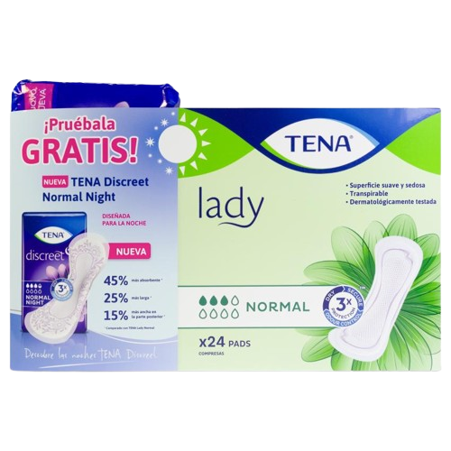 Pack Tena Lady Normal + Discreet Normal Night son compresas que han sido diseñadas especialmente para aquellas mujeres que sufren pérdidas pequeñas o medias de orina, ofreciéndoles protección y comodidad. Han sido elaboradas para atender esos escapes de orina inoportunos e inesperados en medio de una risa, ejercicios o cualquier tipo de actividad. Las compresas cuentan con control de olor y están disponibles en diferentes tamaños y colores, dependiendo si quieres recibir protección durante el día o durante la noche. Los escapes pequeños o abundantes de orina quedan atrapados en la compresa, y da una sensación de frescura, seguridad y comodidad.