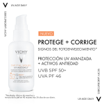Vichy Capital Soleil UV-Age Daily Water Fluid Fotoprotector SPF 50+, es un fotoprotector específico para el rostro de muy alta protección solar para uso diario que ayuda a prevenir los signos del fotoenvejecimiento de la piel provocados por las radiaciones solares UVA y UVB.