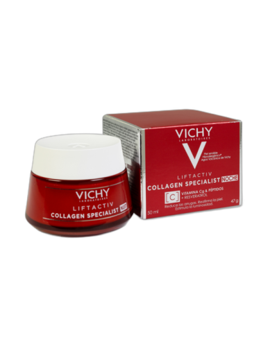 Vichy Liftactiv Collagen Specialist Noche 50 ml. Crema de noche que corrige el daño diario acumulado. Su fórmula posee péptidos reafirmantes, vitaminas Cg iluminadora y resveratrol de origen natural.